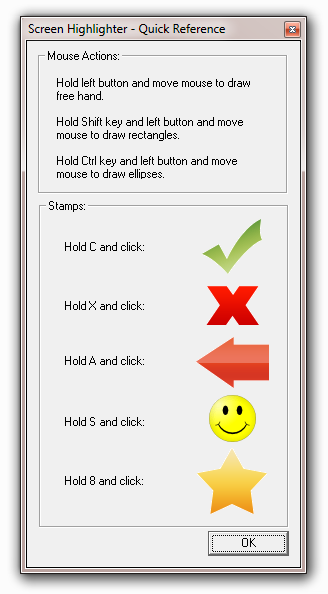 Use Screen Highlighter to annotate or highlight anything on your screen. Just have the program running and hit "Ctrl + H" whenever you want to use it. The cursor turns into a highlighter and you can then draw with it. Circle or underline anything freehand or hold down shift and drag to draw translucent rectangles or anything to highlight it. You can even hold down certain keys and click anywhere on your screen to "stamp" all kinds of different premade icon indicators like stars, checkmarks, arrows, and more.Pictured at right is the program's quick reference dialog showing everything that can be done when the program is active. Visit our download page and get Screen Highlighter completely free now. |
